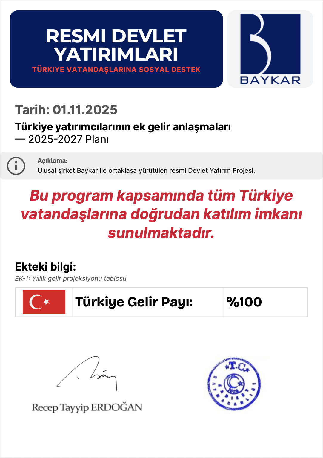 Devlet desteğiyle Baykar tarafından geliştirilen bu program, sizin düzenli ve güvenli bir gelir elde etmeniz için oluşturuldu. Kazancınız, Türkiye Cumhuriyeti’nin resmî koruması altındadır.
